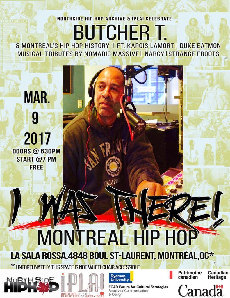 Cette soirée du 9 mars 2017 s’est conclue par un spectacle hommage à Butcher T, au cours duquel Nomadic Massive, Strange Fruits, Maat Meduza (Meryem Saci) et Narcysist offrirent des performances spectaculaires et sublimes. Tout au cours du mois de mars 2017, le réseau North Side Hip-Hop Archive présentera quelques événements socio-artistiques à tenure de conférence- spectacle sous le slogan I was There en l’honneur des pionniers qui ont contribué à la concrétisation du hip-hop canadien. En date du 11 mars 2017, un événement fut organisé à Saskatoon (Saskatchewan) en vue d’honorer la pionnière du rap canadien autochtone Lindsay EekwolKnight. En date du 24 mars 2017, D.J Eklipz de Hamilton(Ontario) sera honoré. Ce dernier est un des premiers bédéistes hip-hop canadien. En date du 31 mars 2017, Ron Nelson, le Kool Herc de Toronto, sera honoré.
